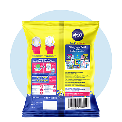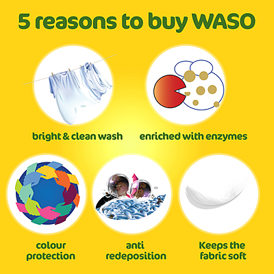 WASO Detergent Powder is designed to penetrate deep into the fabrics and remove the stains at ease. Works even in hard water and provides brilliant results. Apart from cleaning, it helps to keep fabric soft, protects colour. The anti redeposition formula does not allow the dirt suspended on to the water to resettle on the clothes again.